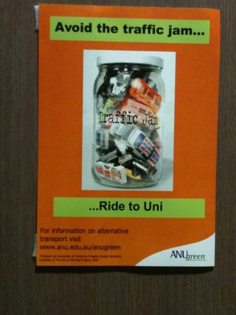 One thing that Canberra prides itself of, is the fact that it’s a bike-friendly place. Several course mates of mine cycle between 20-30mins to school everyday. Great workout, and if need be, there are several shower facilities on campus.